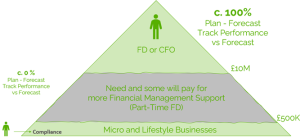 At the base of the pyramid will be the micro and lifestyle businesses who arguably don’t need or want, but more important, cannot or will not pay for part-time FD support. This does not mean there is no commercial opportunity with the micro businesses, see ‘Return on Investment’.