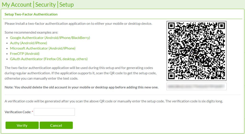 - Open your preferred authentication application on your mobile or desktop device and add a new account, then scan the QR code or enter the text code.