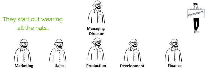 On day one it is just the entrepreneur with an idea for a business, for example an inventor, with a passion for innovation start their own business and they must do everything, (engaging an accountant to help them file their accounts).