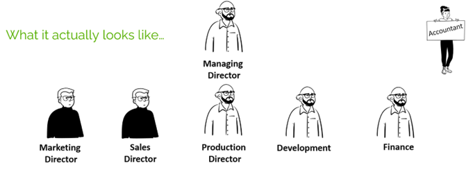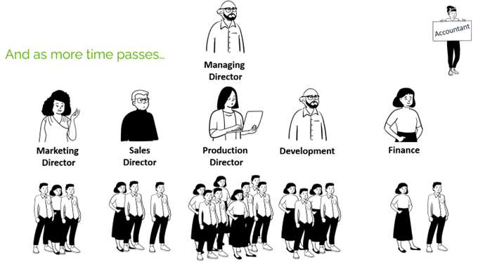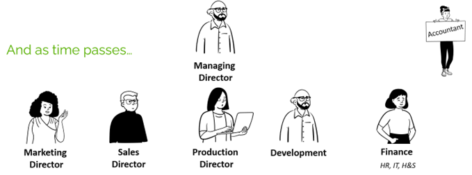 With increased sales effort, all being well the business continues to grow, and over time the owner recruits more people to do the jobs they don’t want to do, (or they acknowledge others could do better), and the team grows with heads of each ‘department’. In many instances, Finance is the last function to be handed over to someone else, and because some things are outsourced, ‘Finance’ (who pay the bills), end up being responsible for other services, like HR, IT and Health and Safety, so the business might end up looking more like this: