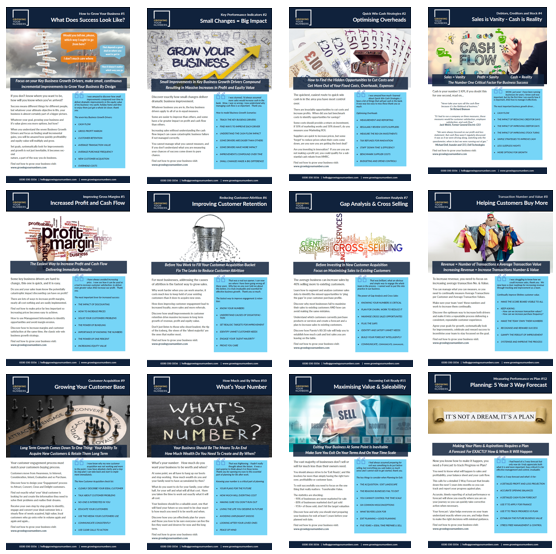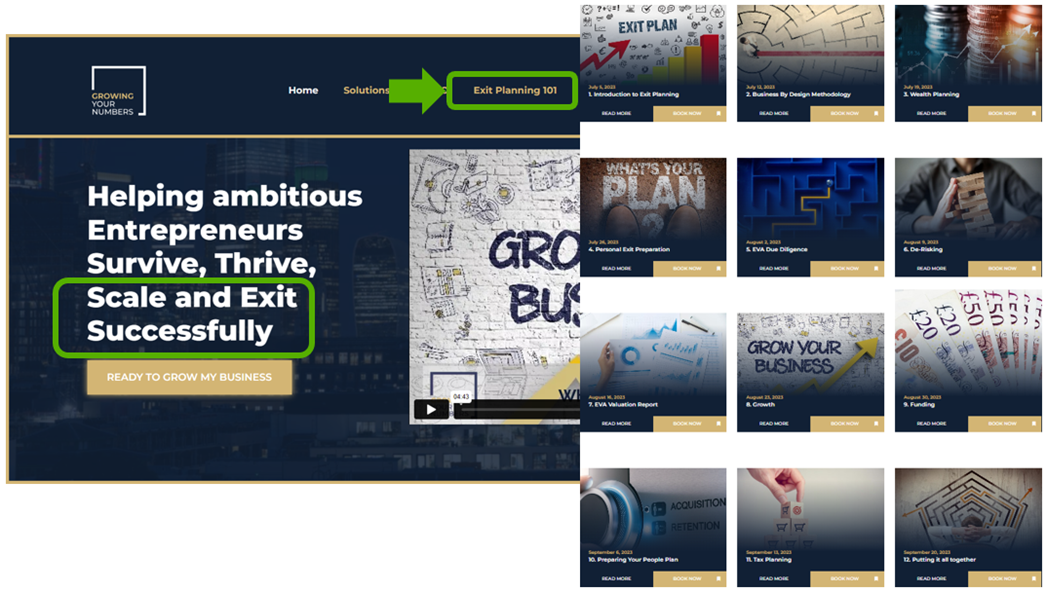 | 1. How to grow your business 2. Key Performance Indicators 3. Quick Win Cash Strategies 4. Improving Cash Flow 5. Margin/Cost Control 6. Customer Attrition 7. Gap Analysis / Cross Selling 8. Transactions No. and Value 9. Customer Acquisition 10. Know Your Number 11. Achieving Exit Readiness 12. Performance vs Plan | 1. Introduction to Exit Planning 2. Business By Design Process 3. Know Your Number 4. Personal Exit Preparation 5. Financial Due Diligence 6. De-Risking 7. Establishing the Right Value 8. Growth 9. Funding 10. Preparing Your People Plan 11. Tax Planning 12. Putting it all together |