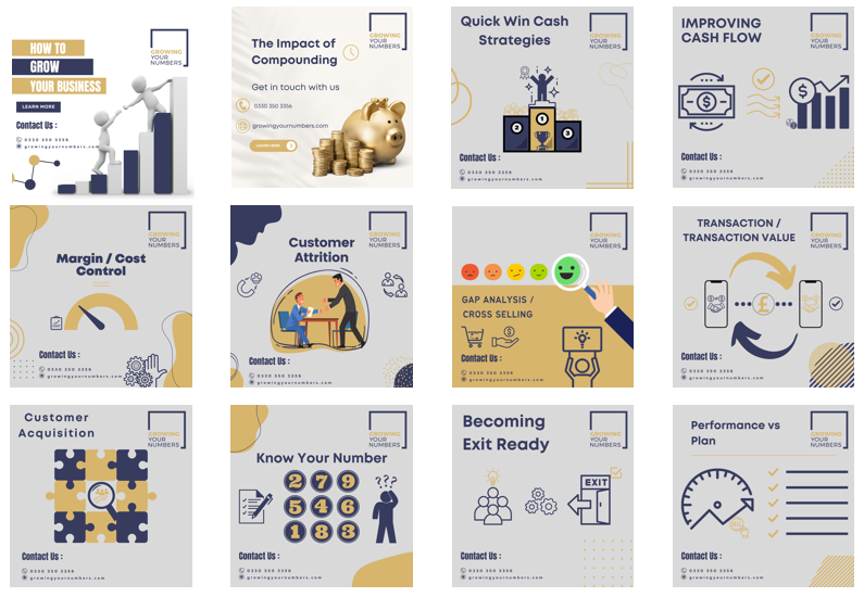 To help you get your marketing working, there is a ton of collateral and templates built using the Growing Your Numbers brand that you are welcome to use either with your own branding, or if you are part of the VFD Way group, you can use the Growing Your Numbers branded materials with your contact details. The collateral includes but is not limited to the following: