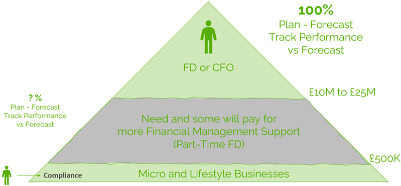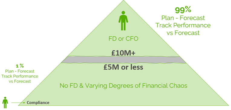Do businesses above a magic £10M line all required a plan and a forecast, but all those below that ‘magic’ line don’t? Clearly this is not the case, this is money being left on the table if you are the accountant providing the compliance service. But if you are the business owner, this is a massive and increasingly urgent problem that you eventually ‘fix’ by appointing an FD to sort it out.