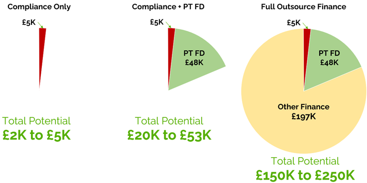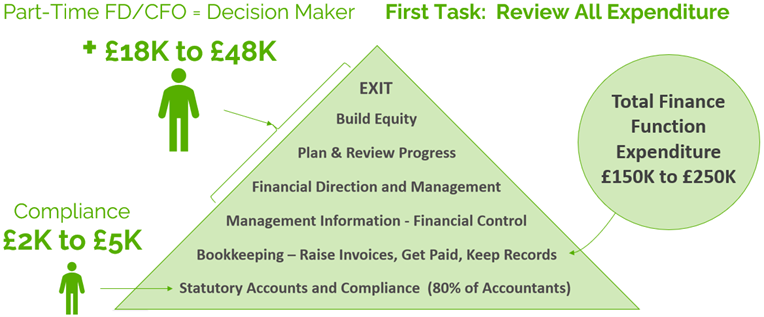 Bear in mind the new part-time FD has been brought into the company because of a perceived failure of the financial department to deliver what the business needs, so the first task is to sort out ‘Finance’. Whatever the start point, the Finance Function must run smoothly, so if the total spend on the Finance Function is in the range £150,000 to £250,000, this is the size of the opportunity.